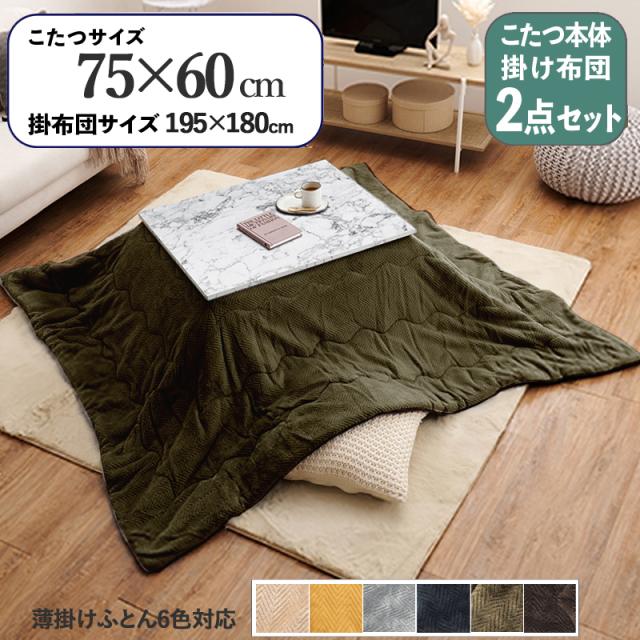 【2点セット】こたつテーブル+こたつ布団 75×60cm カーキ色 長方形 マーブルホワイト 大理石柄 耐水 メラミンシート コンパクト ワンルームこたつ AURA アウラ