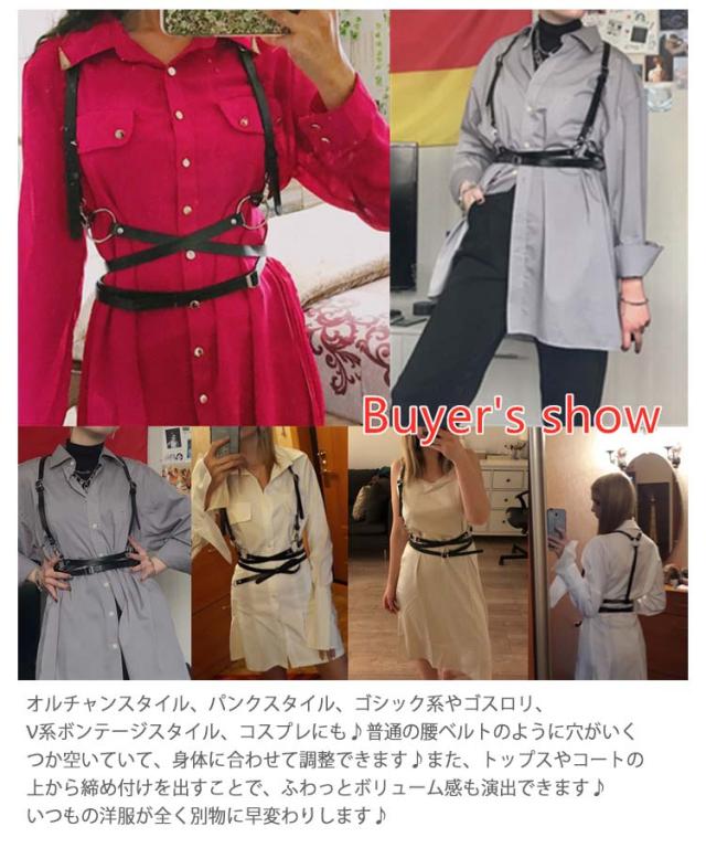 | 【デザイン】人気 レザー調のボディーハーネスです♪ハーネスベルトをすることでオシャレ度アップ♪ 強すぎず、女の子らしい可愛い印象を残して着まわせる、使い勝手の良いハーネスです♪ オルチャンスタイル、パンクスタイル、ゴシック系やゴスロリ、V系ボンテージスタイル、コスプレにも♪ 普通の腰ベルトのように穴がいくつか空いていて、身体に合わせて調整できます♪ 【装着方法】ラインが繋がっているリングが背中になりそこを起点にして、ウエスト部分を2重に巻いてベルトで調整します♪ ベルト部分・ウエストは広い範囲まで調節可能です♪ 【シーン】ワイシャツに取り入れるのがオススメですが、ストリート系、Tシャツ、モード系等ラフな普段のファッションに取り入れてもシックで全体が引き締まります♪ また、トップスやコートの上から締め付けを出すことで、ふわっとボリューム感も演出できます♪ いつもの洋服が全く別物に早変わりします♪ | |