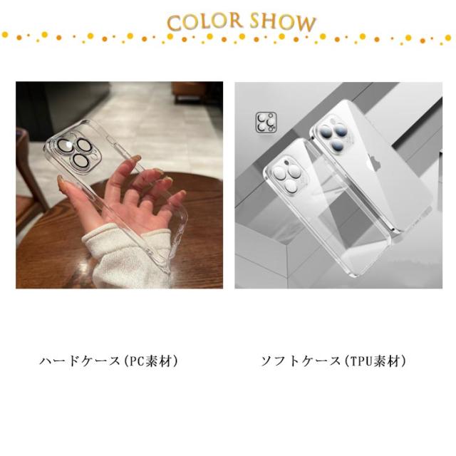 | カメラレンズまで覆う、カメラカバー一体型iphone15 ケース。 レンズ保護フィルム一体型で、カメラレンズまでフルカバー、カメラレンズを傷からしっかりと全面保護。 選べる2素材!柔らかく衝撃吸収の役割を担うTPU素材のケースと、強度のあるPC素材のケースの2種類をご用意しました。 透明なので、iPhone本体の色を楽しむことができます。好きなステッカーを挟んでアレンジOK! | |