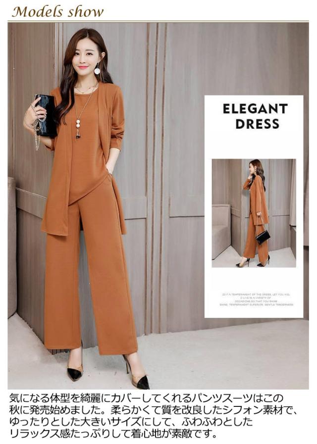 | 気になる体型を綺麗にカバーしてくれるパンツスーツはこの秋に発売始めました。柔らかくて質を改良したシフォン素材で、ゆったりとした大きいサイズにして、ふわふわとしたリラックス感たっぷりして着心地が素敵です。 アンサンブルで全体の風合いが一致できて落ち感があるセットアップです。シンプルですっきりとしたデザインで大人っぽくて上品さも漂っています。2WAY着方ができて、程よい厚さでこれからの季節にご愛用いただけます。 カーディガンは気になる二の腕をすっきりしたラインを作り、カーディガンを脱いでは別の着方になって、機能性があります。ウエスト後ろにゴムも入り、パンツドレスのサイドにポケットもあり、便利でスタイル感アップしてくれます。 無地の厳選された色でトレンドでも定番でもコーデやすいスーツです。ハイウエストのワイドパンツは足長く見えて、定番のラウンドネックは小顔効果があり、立体的な縫製はファッションな3点セットです。 ゆったりしたので体型や年代幅広くて着用いただけ、通勤などのフォーマル場合だけでなく、普通のお出かけなどでも大活躍できるパンツスーツです。 | |