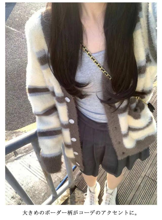 もこもこ ニット カーディガン レディース ボーダー柄 ニットコート ふわふわ ファーカーディガン ニットカーディガン Vネック 大きサイズ ゆったり キレイめ 秋冬 体型カバー
