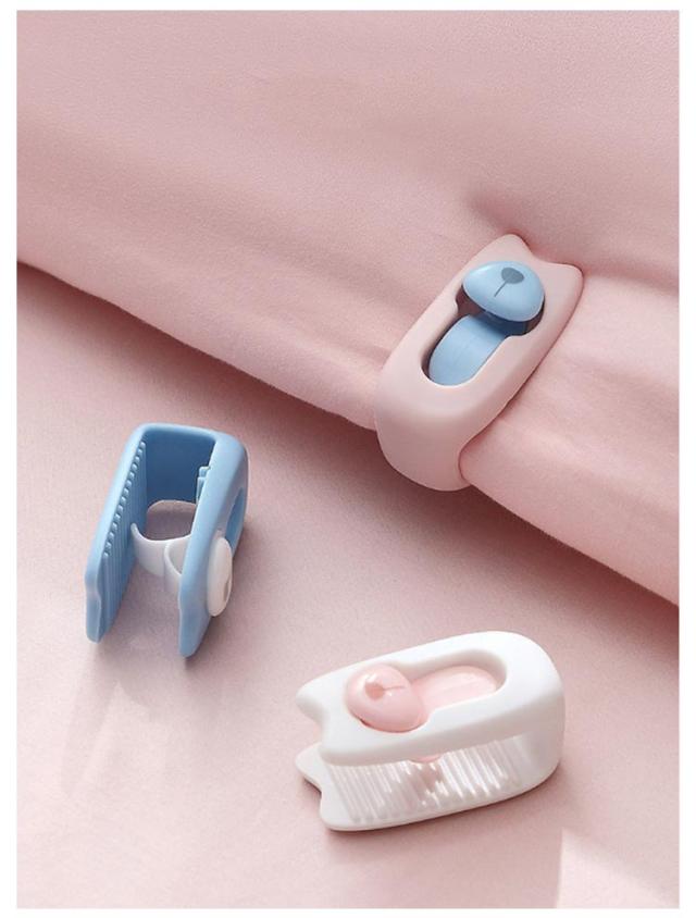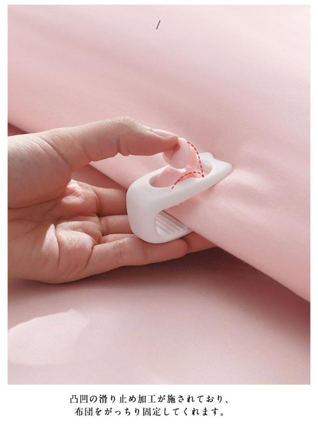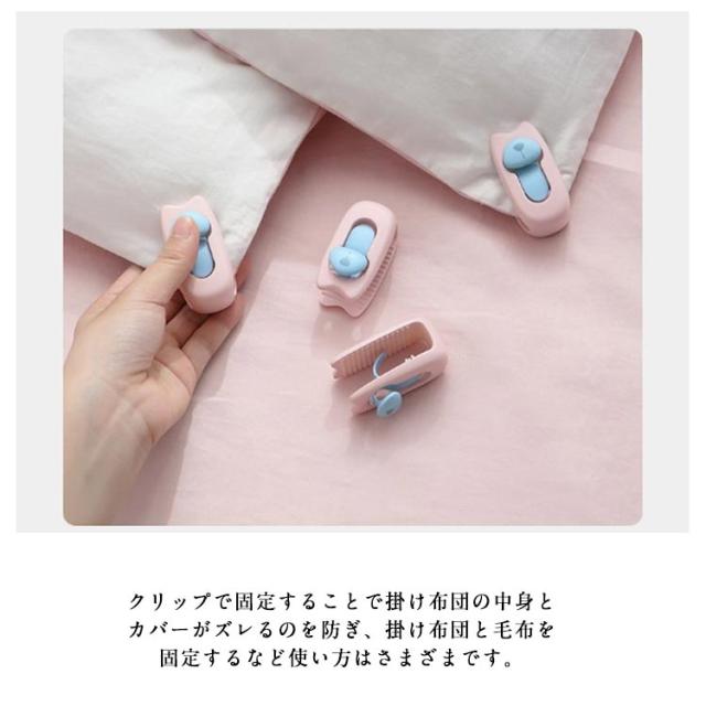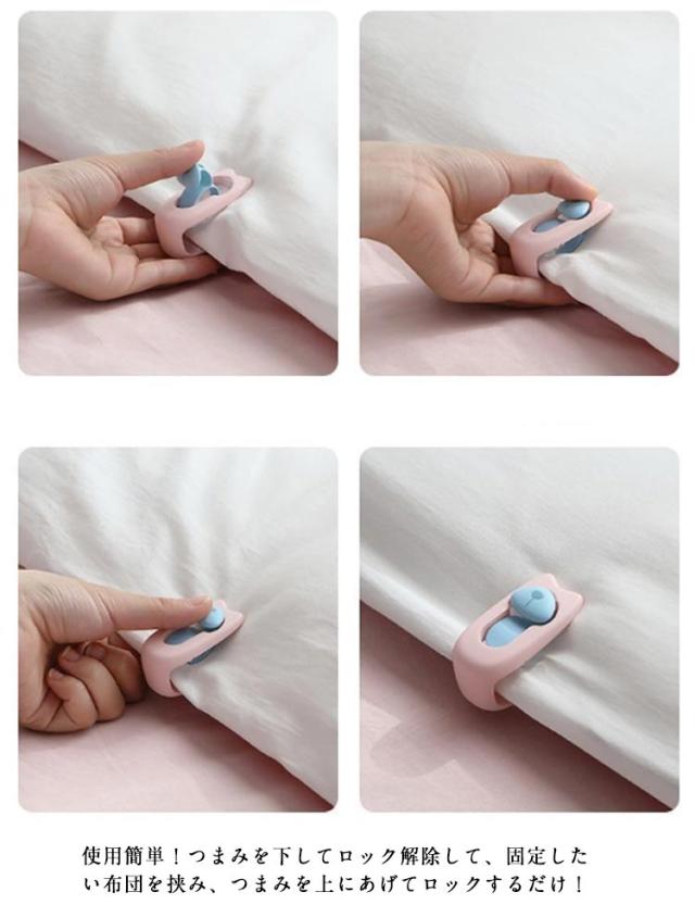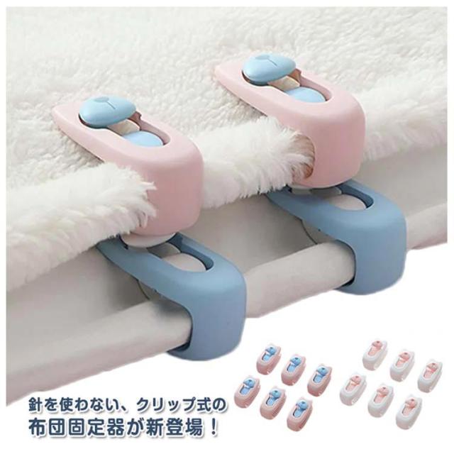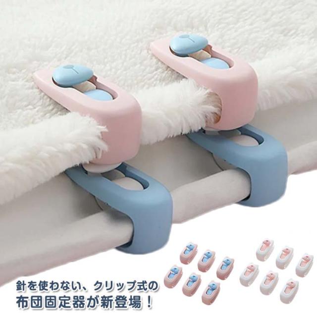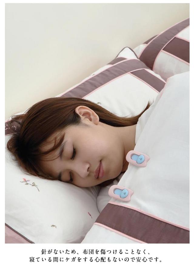 | 針を使わない、クリップ式の布団固定器が新登場! 針がないため、布団を傷つけることなく、寝ている間にケガをする心配もないので安心です。 使用簡単!つまみを下してロック解除して、固定したい布団を挟み、つまみを上にあげてロックするだけ! 凸凹の滑り止め加工が施されており、布団をがっちり固定してくれます。 クリップで固定することで掛け布団の中身とカバーがズレるのを防ぎ、掛け布団と毛布を固定するなど使い方はさまざまです。 睡眠中の寝返りをうっても掛け布団やシーツが反転したり・絡まったりせず、一晩中快適な寝心地を実現。 | |