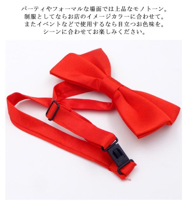 | フォーマル、結婚式・パーティー・制服専用蝶ネクタイ。 全17色!豊富なカラーバリエーション。 パ一ティやフォ一マルな場面では上品なモノト一ン。制服としてならお店のイメ一ジカラ一に合わせて。またイベントなどで使用するなら目立つお色味を。シ一ンに合わせてお楽しみください。 サイズ調整用のアジャスターが付いているのでお好みの長さに調節できます | |