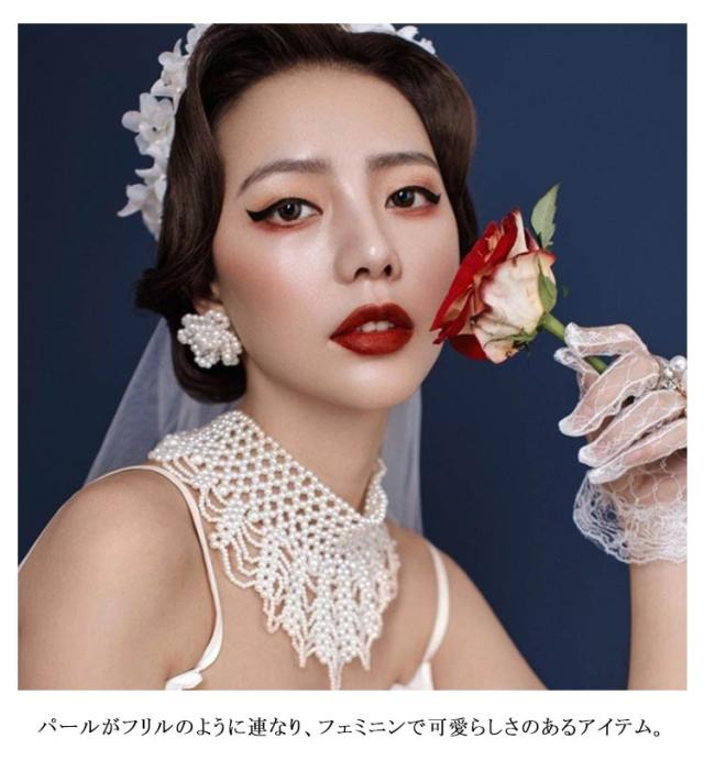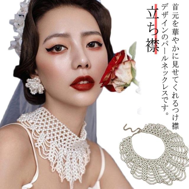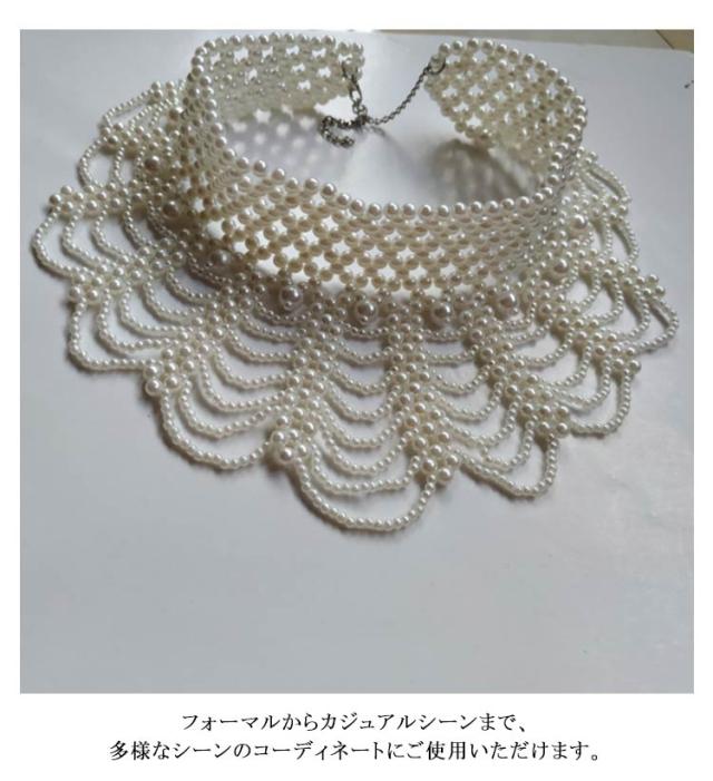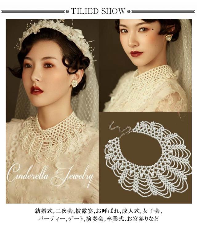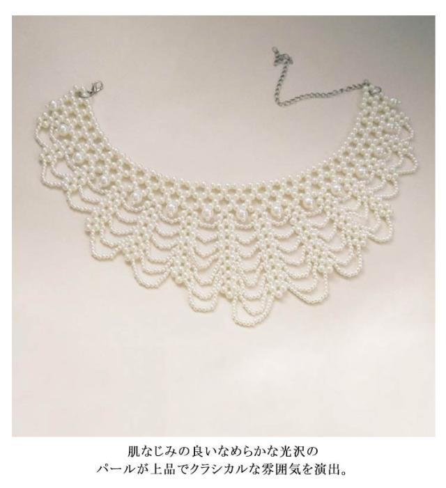 パール ネックレス つけ襟 フリル ロング 結婚式 フォーマル パールカラーネックレス パールックレス 大粒 小粒パール 大きめ襟 レトロ調 つけえり 付け衿 ウェディング ドレス 用