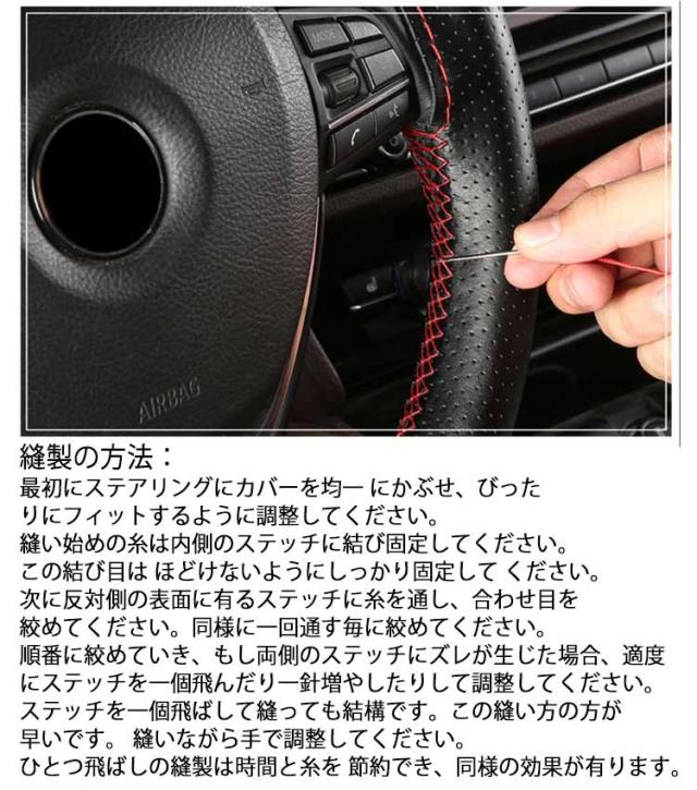 | ハンドルに巻き付けて、針と糸で編み上げていくタイプのハンドルカバーです。 革特有のしっとりと手に馴染む独特の感触をお楽しみいただけます。 製の編み込みハンドルカバーは握った時にフィット感がある。 ハンドルカバーの表面に小さな穴を使用して、下に柔らかい滑り止めるのデザインです。 縫製の方法: 最初にステアリングにカバーを均一 にかぶせ、びったりにフィットするように調整してください。 縫い始めの糸は内側のステッチに結び固定してください。この結び目は ほどけないようにしっかり固定して ください。 次に反対側の表面に有るステッチに糸を通し、合わせ目を絞めてください。同様に一回通す毎に絞めてください。 順番に絞めていき、もし両側のステッチにズレが生じた場合、適度にステッチを一個飛んだり一針増やしたりして調整してください。 ステッチを一個飛ばして縫っても結構です。この縫い方の方が早いです。 縫いながら手で調整してください。 ひとつ飛ばしの縫製は時間と糸を 節約でき、同様の効果が有ります。 | |