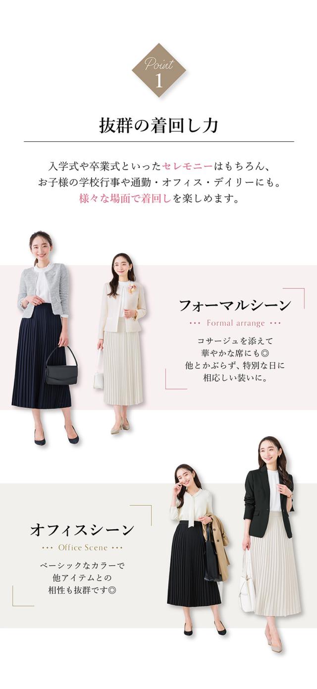 入学式やお呼ばれなどのオケージョンシーンに対応するキレイ見えするデザイン。派手すぎないデザインなので通勤やオフィスシーンにも活躍します。