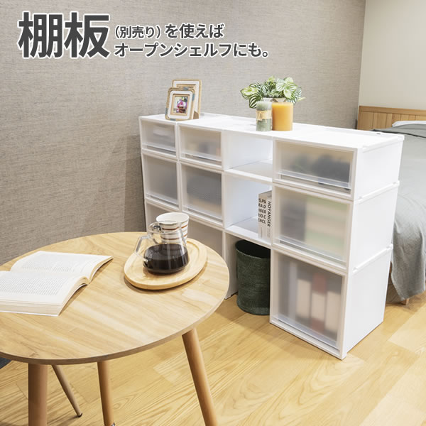 ホワイトクリア色の前面は高見えするすりガラス調。うっすら収納物が透けて見える実用性も◎。