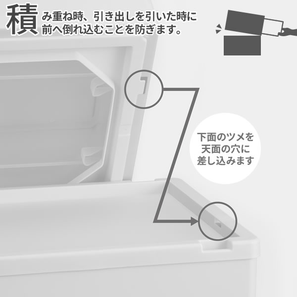 前倒れ防止機能付き積み重ねた状態で引き出しを引いた時に、ケースの後ろ側が浮き上がり前へ倒れてしまうことを防ぎます。
