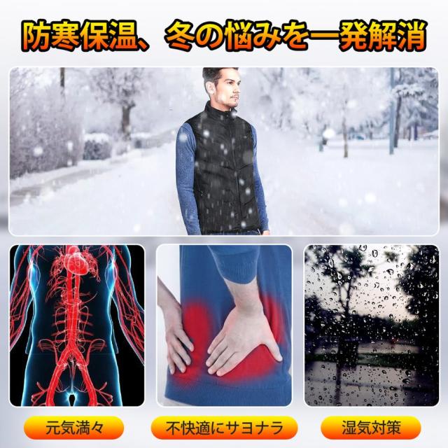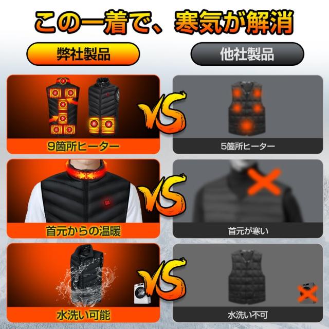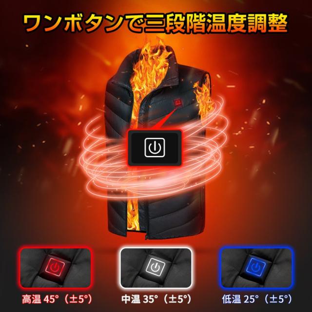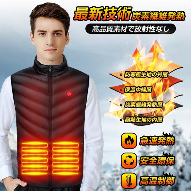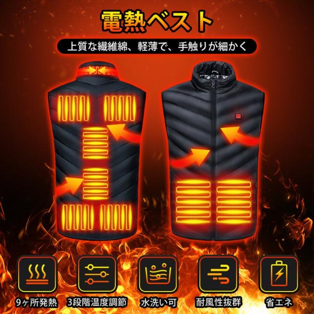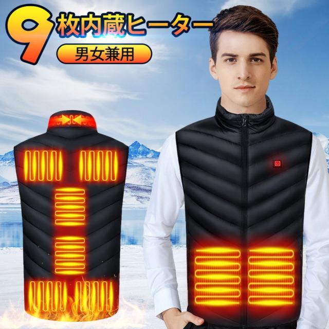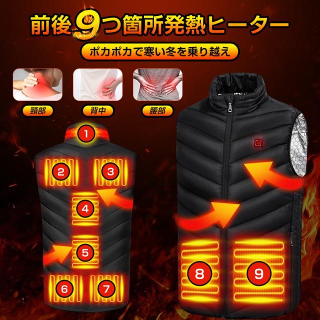 電熱ベスト 日本製繊維ヒーター ヒーターベスト バッテリー給電 9エリア発熱 USB 3段階温度調整 アウトドア 水洗い可能 男女兼用 メンズ レディース