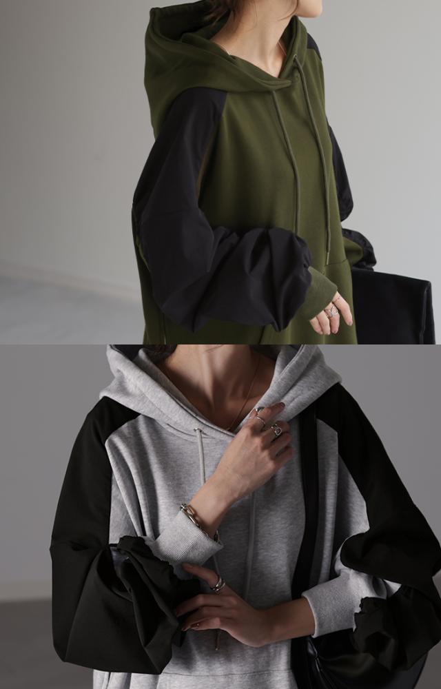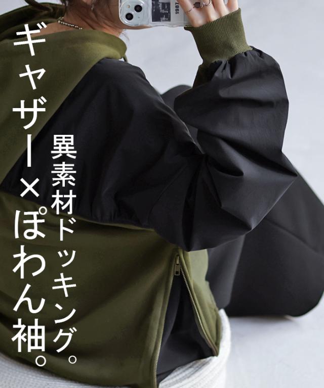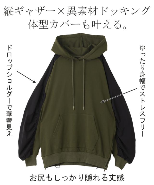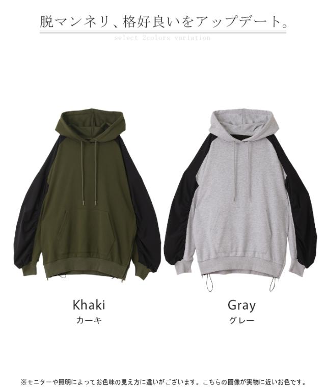 【冬SALE】 求めてた。「 甘すぎない 」ぽわん パーカー アウター レディース ライトアウター トップス トレーナー スウェット フーディー ビッグ ドルマン ギャザー 異素材 ミリタリー ぽわん袖 体型カバー 変形 変形シルエット 大きいサイズ カーキ 秋 冬 HUG.U 秋新作