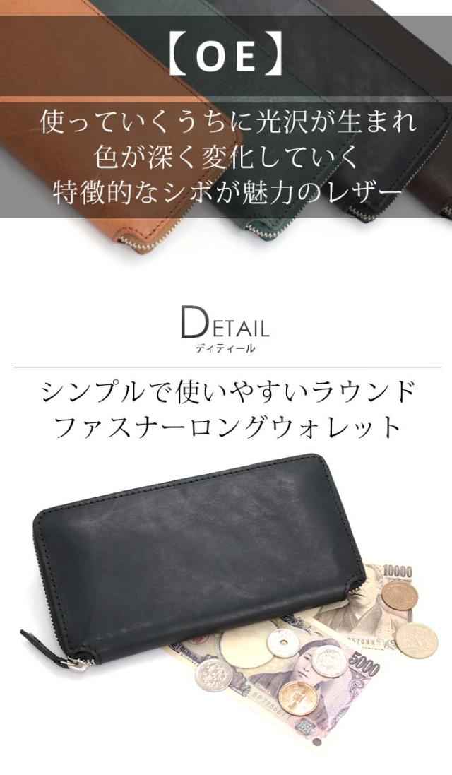 オイルをたっぷり含んだプルアップレザーを使用した『OE(オーイー)』シリーズの長財布。開口部はラウンドファスナー式で開閉しやすく出し入れ楽々。