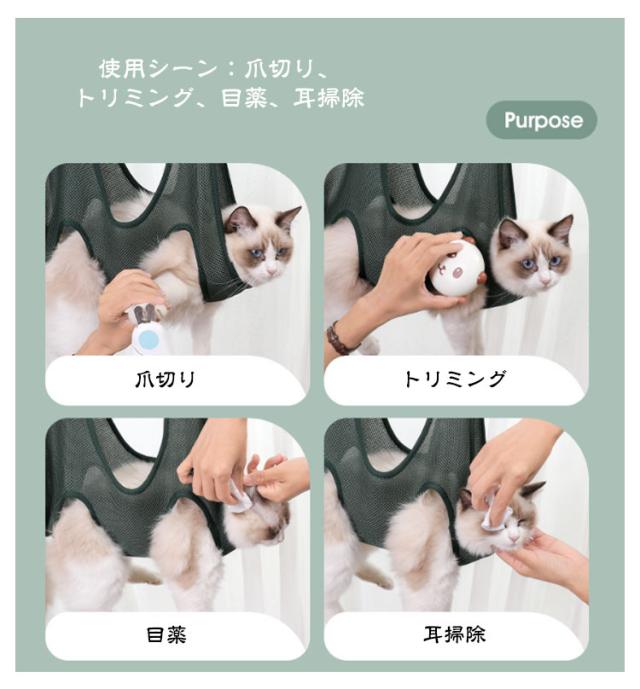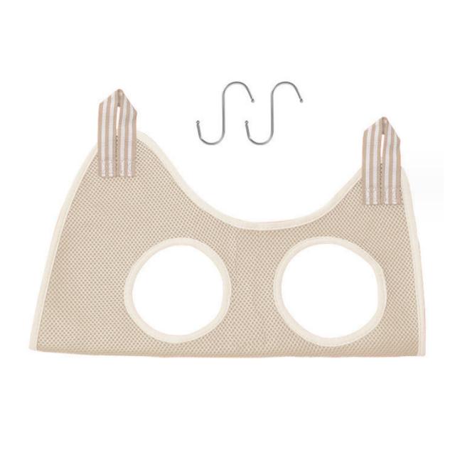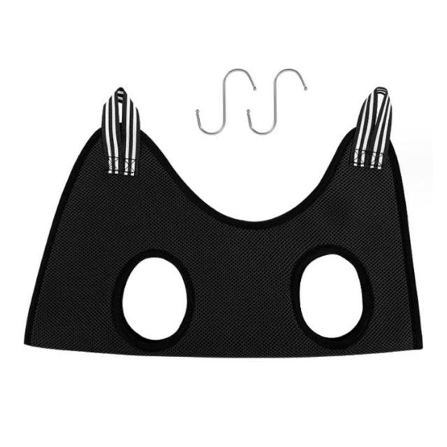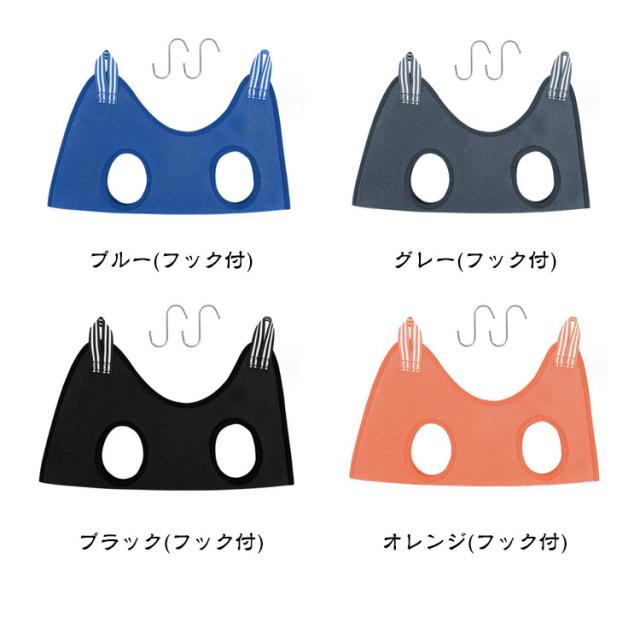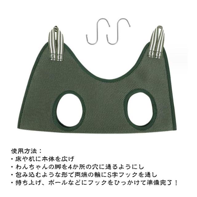 | 【猫・小型犬〜中型犬まで対応】 【グルーミングハンモック】 通気性の良いメッシュ生地を使用 ホール周りはクッション性があり肌にやさしいのが◎ 使用シーン:爪切り、トリミング、目薬、耳掃除 使用方法: ・床や机に本体を広げ ・わんちゃんの脚を4か所の穴に通るようにし ・包み込むような形で両端の輪にS字フックを通し ・持ち上げ、ポールなどにフックをひっかけて準備完了! | |