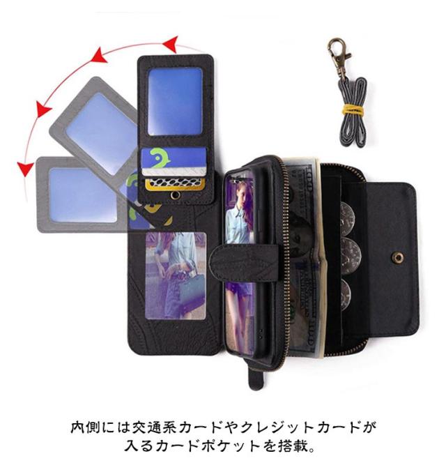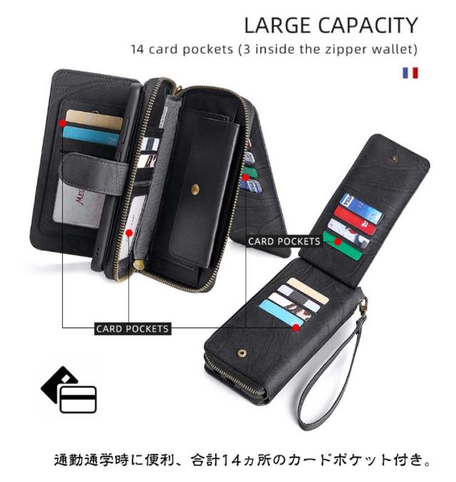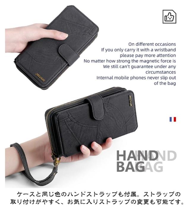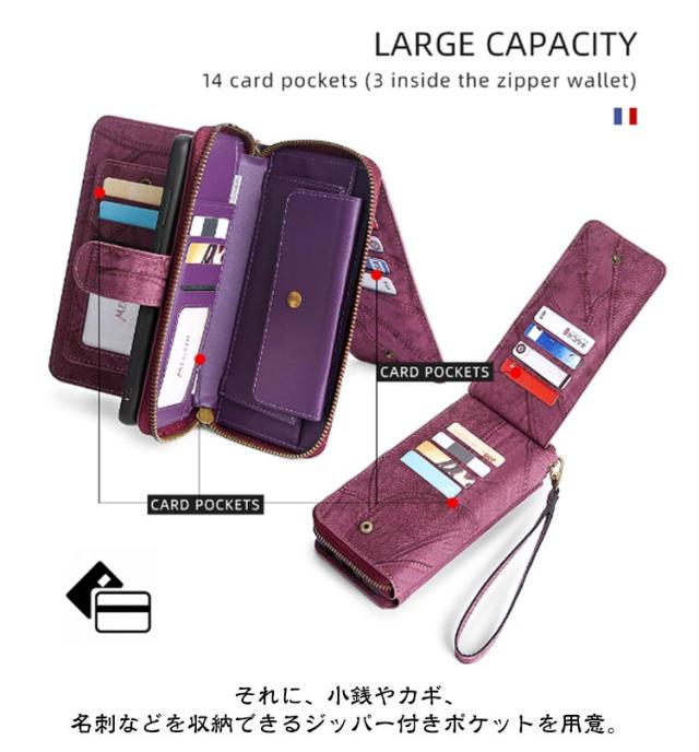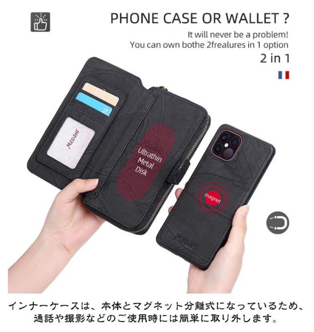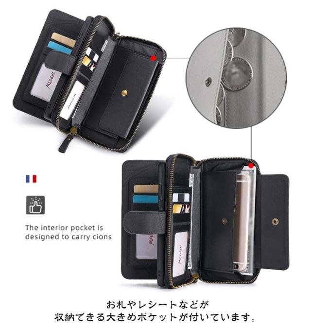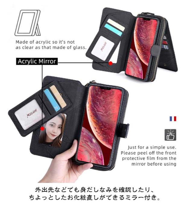 | 【対応機種】iPhone 【素材】PUレザー TPU 【セット内容】スマホケース(iPhone本体は同梱されておりません) 【特徴】外出先などでも身だしなみを確認したり、 ちよっとしたお化粧直しができるミラー付き。 インナーケースは、本体とマグネット分離式になっているため、通話や撮影などのご使用時には簡単に取り外します。 内側には交通系カードやクレジットカードが入るカードポケットを搭載。 お札やレシートなどが収納できる大きめポケットが付いています。 それに、小銭やカギ、名刺などを収納できるジッパー付きポケットを用意。 お出かけ際に、これだけを持っていけば十分! スマホを横置きできるスタンド機能で長時間の動画視聴もらくらく!新幹線、飛行機の中での暇つぶしに最適です。 上品な質感のPUレザーを使用し、触り心地や耐久性も抜群。 カメラレンズ周囲の穴に段差を設けることによって、iPhoneの突出したレンズを保護。 通勤通学時に便利、合計14ヵ所のカードポケット付き。 ケースと同じ色のハンドストラップも付属。ストラップの取り付けがやすく、お気に入りストラップの変更も可能です。 | |