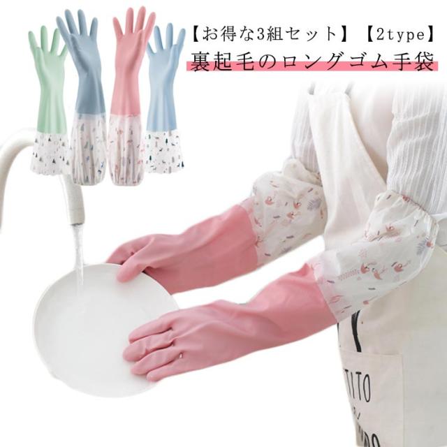 【裏起毛】お得な3組セット ゴム手袋 冬用 キッチン 手袋 ゴム ロンググローブ ロングスリーブ 丈が長い 食器洗い キッチン掃除 トイレ掃除 浴室掃除 クリーニング 掃除 ロング キッチングローブ 家事用 グローブ お風呂掃除 床掃除 ガーデニング S M L レディース
