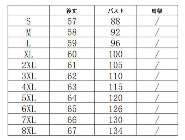 | サイズ | S M L XL 2XL 3XL 4XL 5XL 6XL 7XL 8XL |
