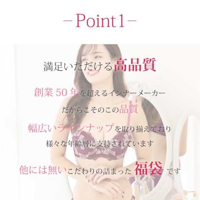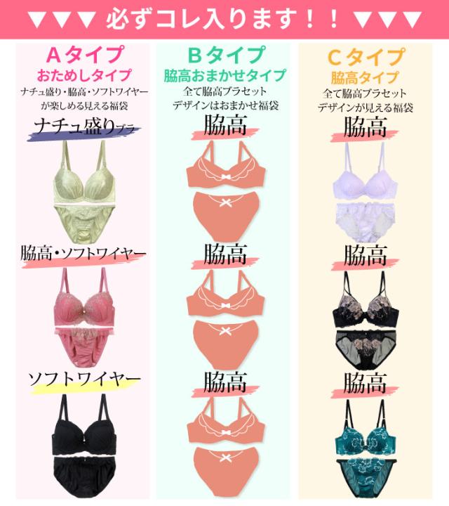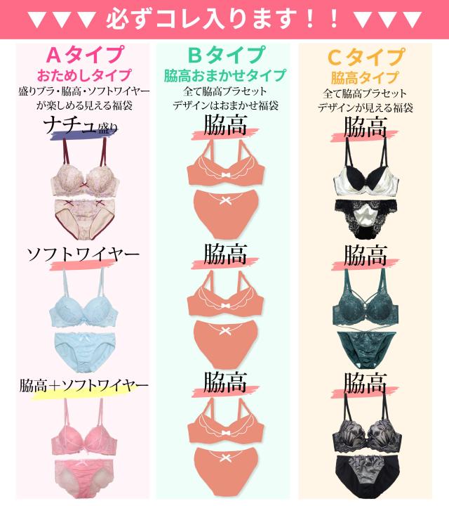 中身が見える福袋におためし3種&おまかせデザイン脇高オンリー3種詰め合わせ福袋登場!盛りブラ・脇高・ソフトワイヤーの3種類入り!詳細画像のスタッフ厳選の新作ブラセット3点が必ず入ります。福袋にチャレンジしてみたいと思っていた方にも、リピーターの方にもおすすめです。