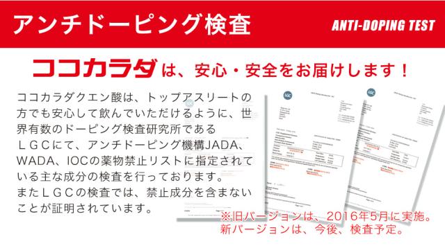 ココカラダアミノ酸は、アンチドーピング機構JADA、WADA、IOCの薬物禁止リストに指定されている主な成分の検査を、世界有数のドーピング検査研究所にて行っており、禁止成分を含まないことが証明されています。(2024年12月の検査)