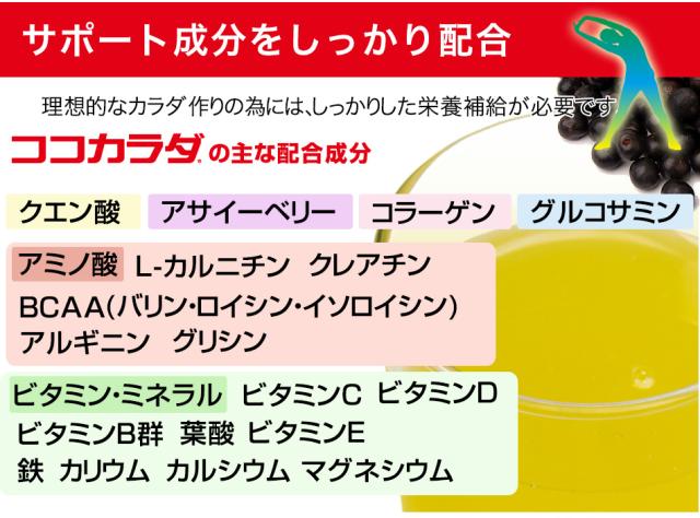 「ココカラダ NEW クエン酸粉末飲料 500g」は、クエン酸を主成分に、アマゾンのフルーツ アサイーベリー、L-カルニチン、クレアチン、コラーゲン、グルコサミン、アミノ酸、ビタミンなどをバランス良く配合した健康粉末飲料です。20g中にクエン酸 5400mg、アサイーエキス 200mg、コラーゲン 1000mgを配合。クエン酸サイクル活動をスムーズにしながら、各種栄養素も補給できます。すっぱさと甘さのバランスがくせになる、飲み口を実現。スポーツ時のエネルギー補給やダイエットなどにお役立てください。