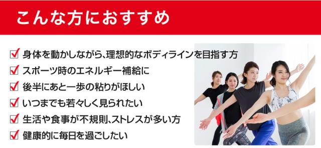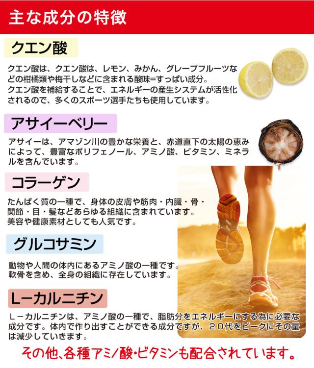 甜菜糖(国内製造)、コラーゲンペプチド、アサイーエキス末、L-カルニチンフマル酸塩、コーンスターチ、クレアチン/クエン酸、乳酸Ca、グルコサミン、グリシン、硫酸マグネシウム、クエン酸Na、甘味料(ステビア、アセスルファムカリウム、スクラロース)、プルラン、微粒二酸化ケイ素、リン酸Ca、バリン、ロイシン、イソロイシン、アルギニン、塩化カリウム、香料、ビタミンC、クエン酸第一鉄ナトリウム、ビタミンB2、ビタミンE、ニコチン酸アミド、パントテン酸Ca、ビタミンB1、ビタミンA、ビタミンB6、葉酸、ビタミンD、ビタミンB12、(一部にゼラチン・乳成分・えび・かにを含む)