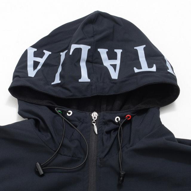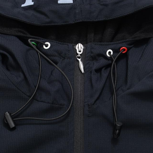 フードにロゴプリントをほどこしコーデのアクセントにした長袖ジップアップパーカー。