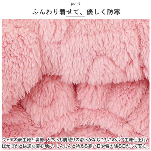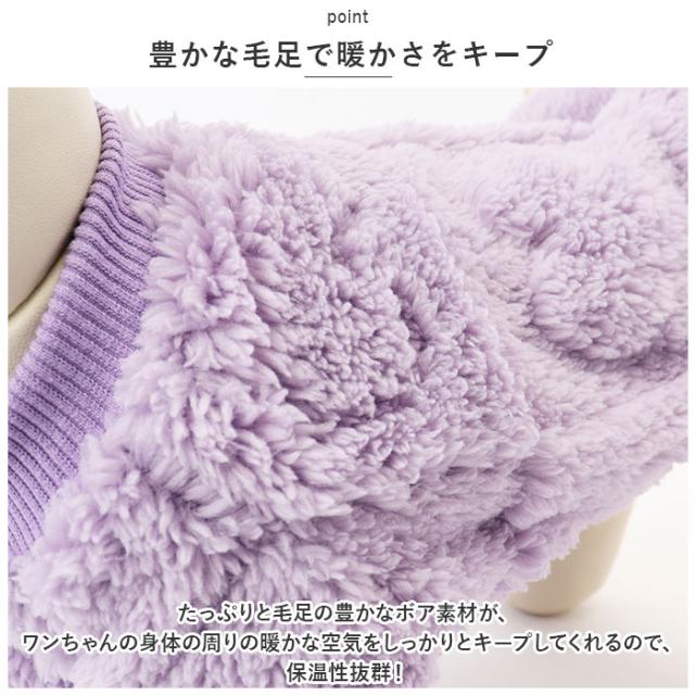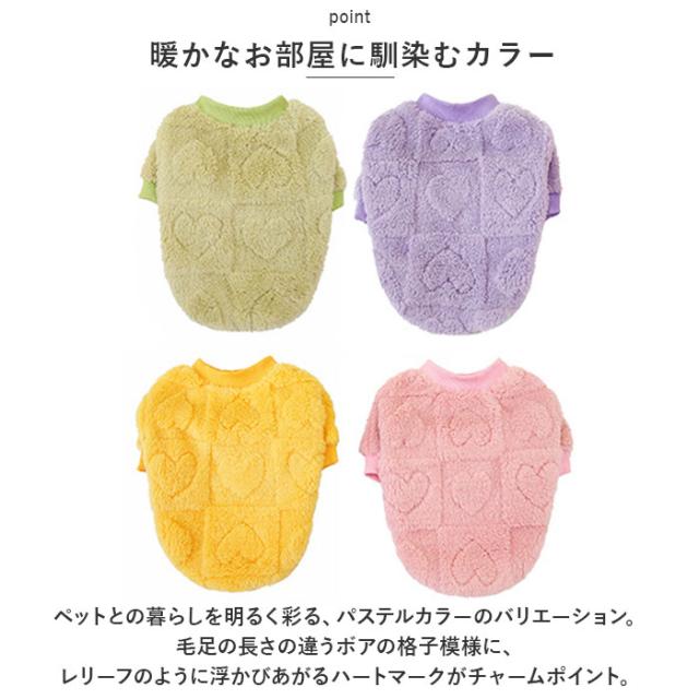 | 商品説明 | ・お散歩はもちろん、気軽に着れるルームウェアにも♪もこもこボアでポカポカ快適!「防寒ペットウェア」が新登場。 【ふんわり着せて、優しく防寒】 ・ウェアの表生地と裏地、どちらも肌触りの滑らかなもこもこのボア生地仕上げ。ぽかぽかと快適な着心地で、しんしんと冷える寒い日や雪の降る日だって安心。 【豊かな毛足で暖かさをキープ】 ・たっぷりと毛足の豊かなボア素材が、ワンちゃんの身体の周りの暖かな空気をしっかりとキープしてくれるので、保温性抜群! 【すっぽり被せて、ラクラク着せ替え】 ・首回りやお腹周りの生地をぐーんと伸ばしたら、ペットの頭にすっぽりと被せて、両前脚を優しく袖に通してあげるだけ!お散歩前の着せ替えが簡単なプルオーバータイプ。 【ピタッと可愛いシルエットに】 ・首回りや袖口、ウェアの裾は伸縮性のあるリブ生地で仕上げてあるため、ワンちゃんの身体のラインにぴったりフィット。スキマ風をシャットアウトして、木枯らしが吹く日も元気にお散歩。 【おトイレの時も安心】 ・お腹まわりやお尻は大きく開いたデザインなので、おトイレでウェアの生地を汚す心配がないのも嬉しいポイント! 【ご家庭で簡単お洗濯♪】 ・取り扱いが楽なポリエステル素材なので、優しく手洗いすればご家庭で手軽にお洗濯OK!こまめにお手入れしていつでも清潔な着心地をキープ。(※タンブラー乾燥はご利用いただけません。) 【ピッタリサイズをチョイス!】 ・Sサイズから2XLサイズまでの5つのサイズから、ぴったりサイズがチョイス可能!超小型犬から、胴回り60cm程度までの中型のワンちゃんに最適なサイズ感。小さなサイズはネコちゃんにもオススメ。 【暖かなお部屋に馴染むカラー】 ・ペットとの暮らしを明るく彩る、パステルカラーのバリエーション。毛足の長さの違うボアの格子模様に、レリーフのように浮かびあがるハートマークがチャームポイント。 【ルームウェアにも◎】 ・肌寒さが気になる季節のお散歩用ウェアとしてはもちろん、ルームウェアやパジャマとして、朝晩の冷え込み対策にもオススメ。 |