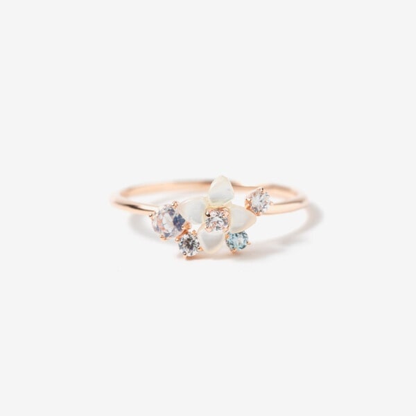 天然石やシェルを使ったブバリアのリングは誕生石が寄り添う誕生花の繊細なジュエリーです。