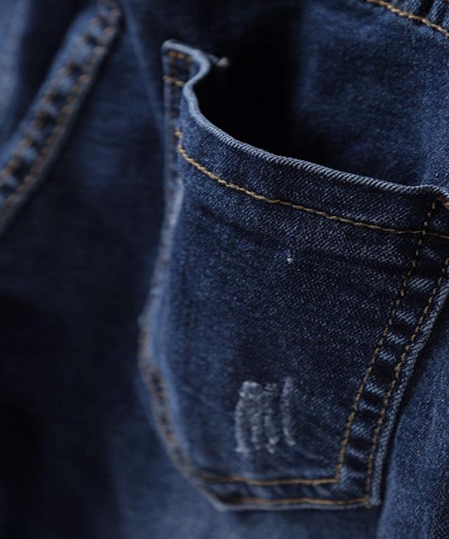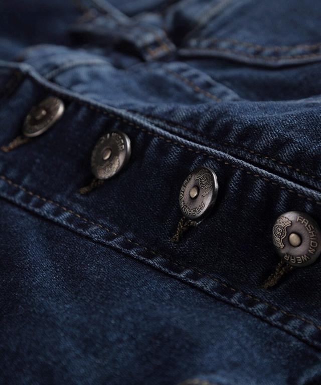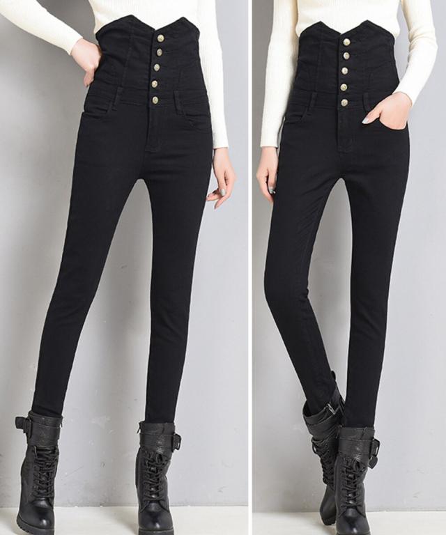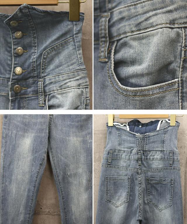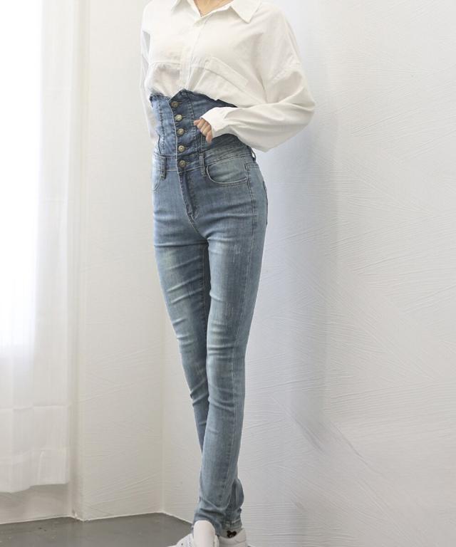 Vカットウエストが個性的、カジュアルながらもトレンディで他と被らないシングルブレストスキニーデニムパンツ