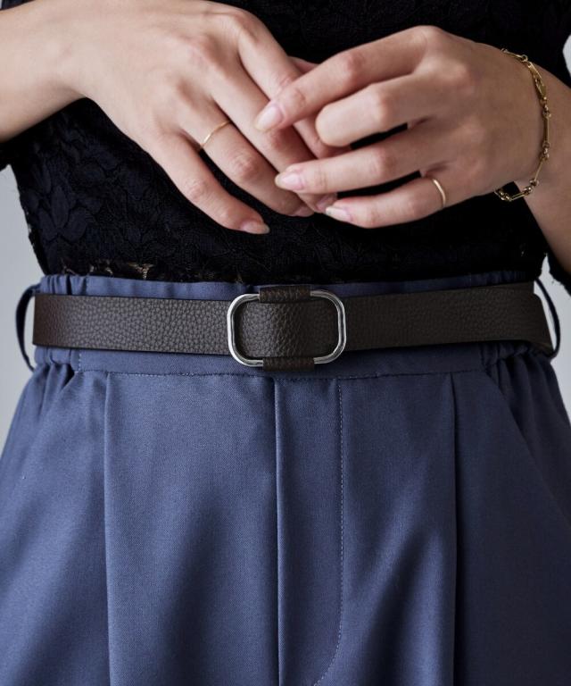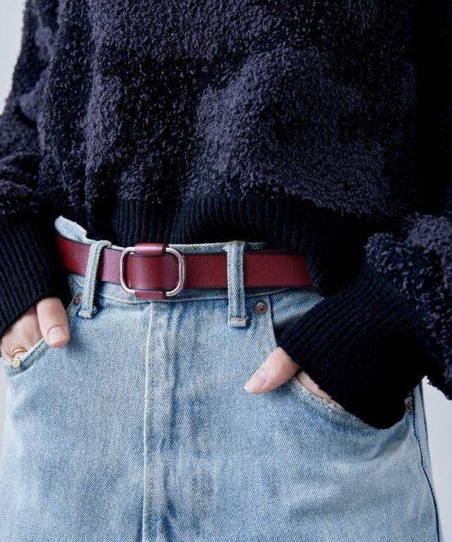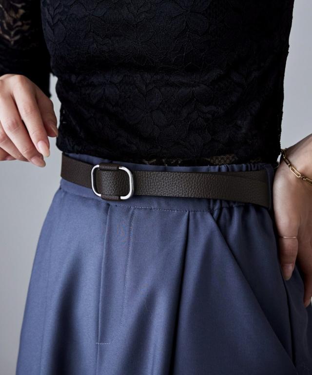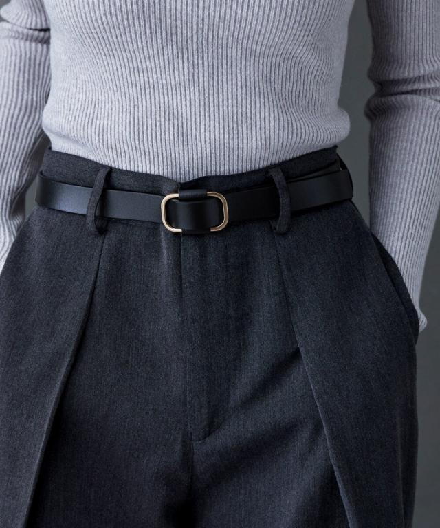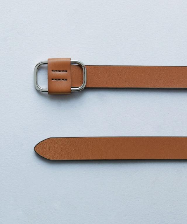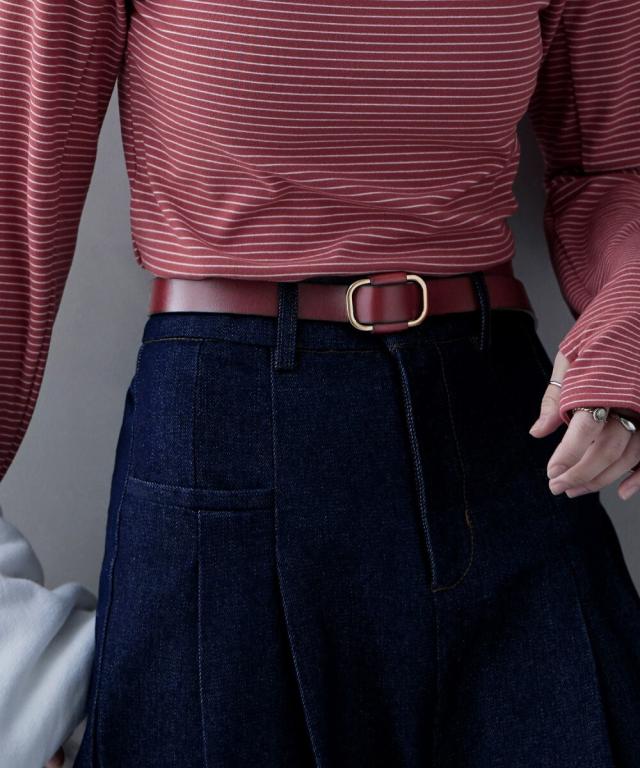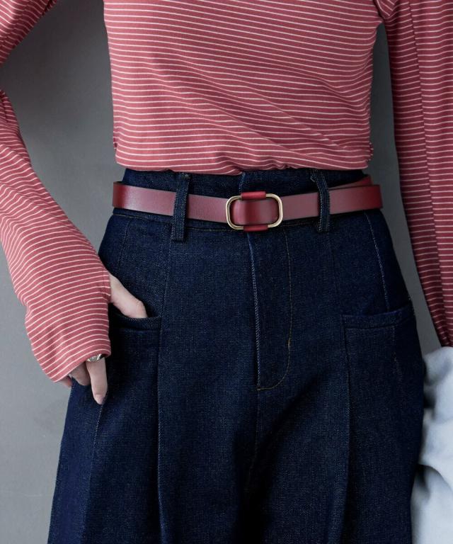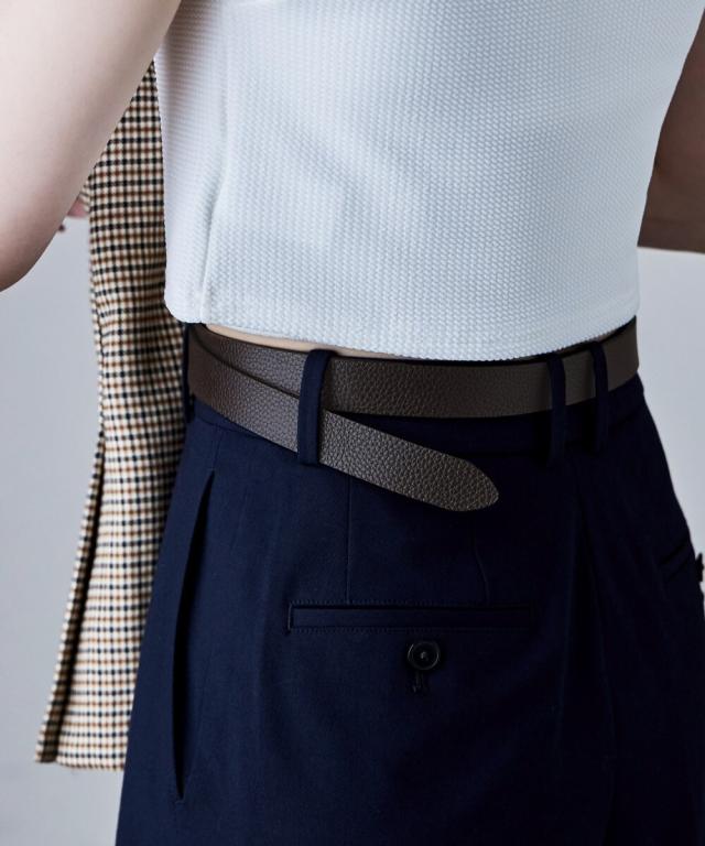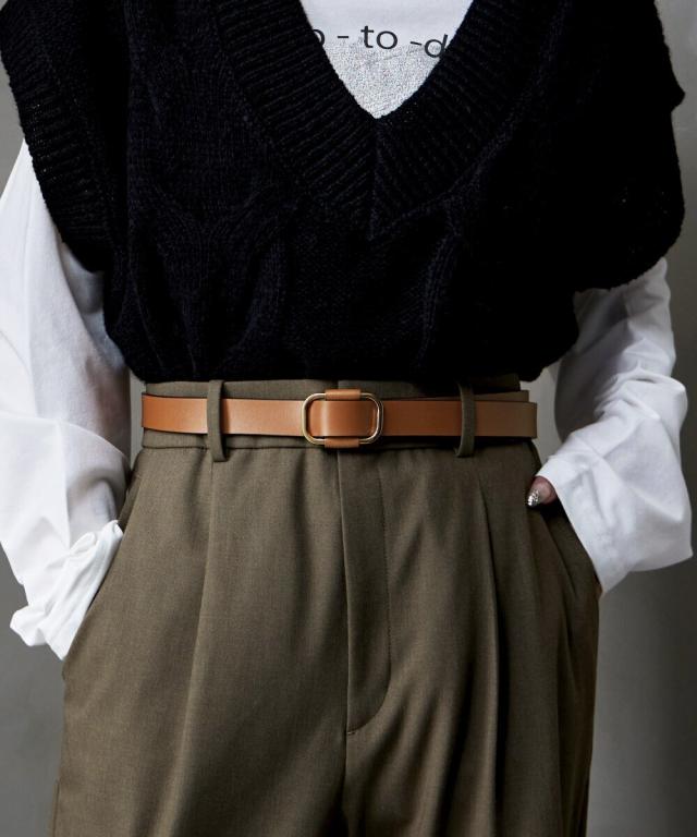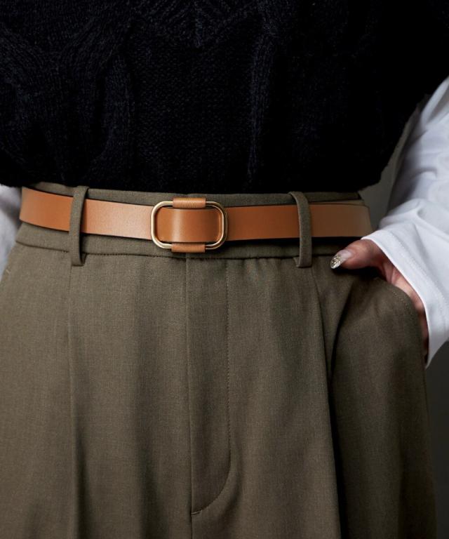 濃色にも淡色にも馴染みやすいカラーは、どんな色とも親しめるから、さりげなくベルトで色を取り入れられる。