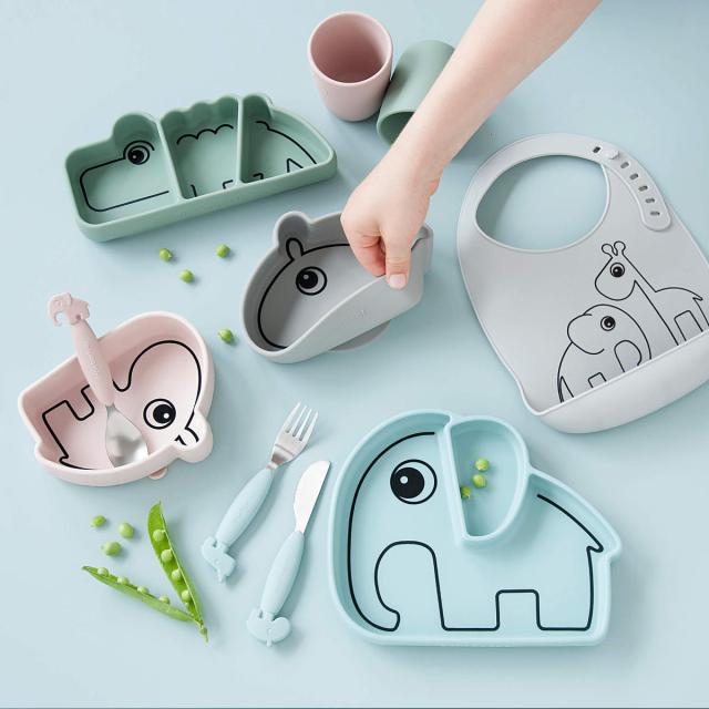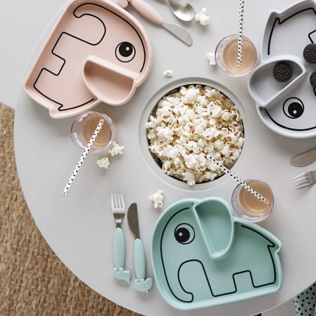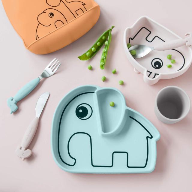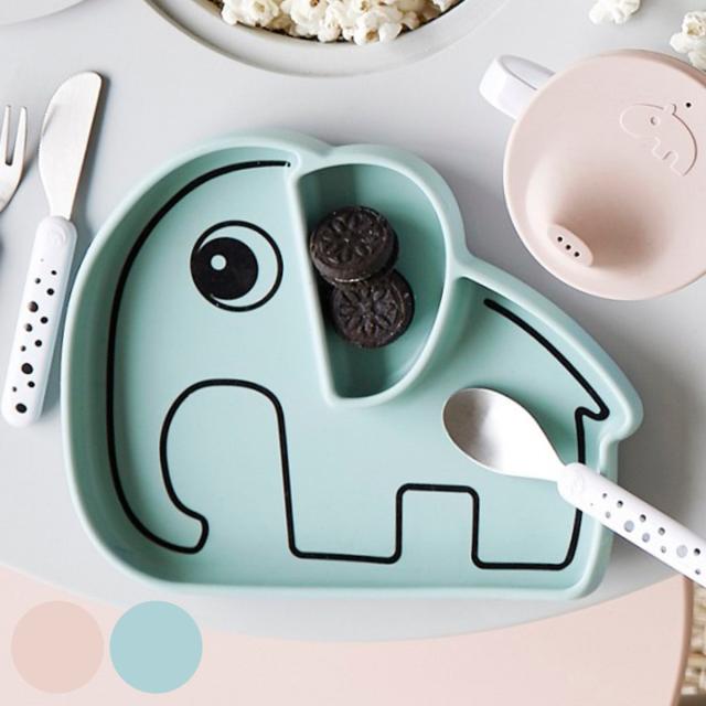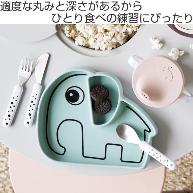 全体的に丸みと適度な深さがあるため食材をすくいやすく、お子さまのひとり食べの練習にぴったりなシリコン製プレートです。ゾウのエルフィーをかたどった可愛いデザインで、食事タイムも楽しくなります。