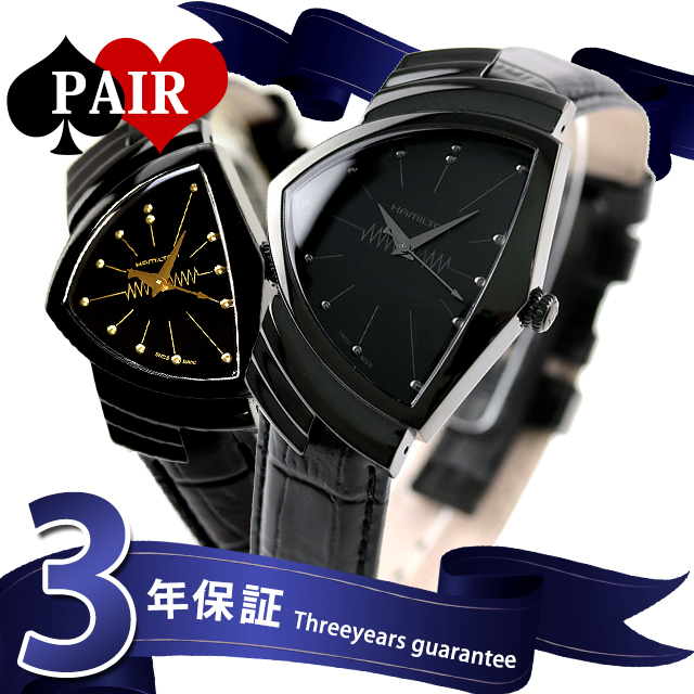 3年保証キャンペーン ペアウォッチ ハミルトン スイス製 クオーツ メンズ レディース 腕時計 pair-hamilton22 HAMILTON アナログ ブラック ◆HAMILTON(ハミルトン)はアメリカ発祥の老舗ブランドです。創業翌年に誕生した懐中時計「ブロードウェイ・リミテッド」は、他の時計よりも正確に時を刻むことから鉄道用時計として採用されました。その後も航空用時計や軍用時計として採用されるなど、品質の高さと流行にながされない独自のデザインが世界中の人々に支持されています。 時計史上の革命児「ベンチュラ」。常識とかけ離れた左右非対称のフォルムは、保守的なデザインが主流であった時計業界に波紋を投げかけ、デザインウォッチの先駆けとして後世に大きな影響を及ぼしました。斬新で新鮮に映るデザインが個性的かつ、圧倒的な存在感を放っています。誕生日や記念日のプレゼントにもおすすめです。 メンズ品番:H24401731 レディース品番:H24201730