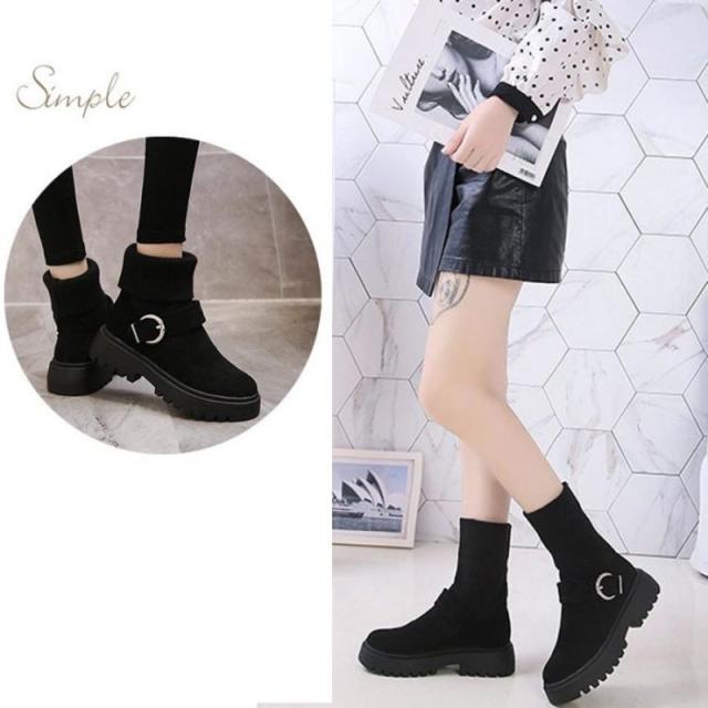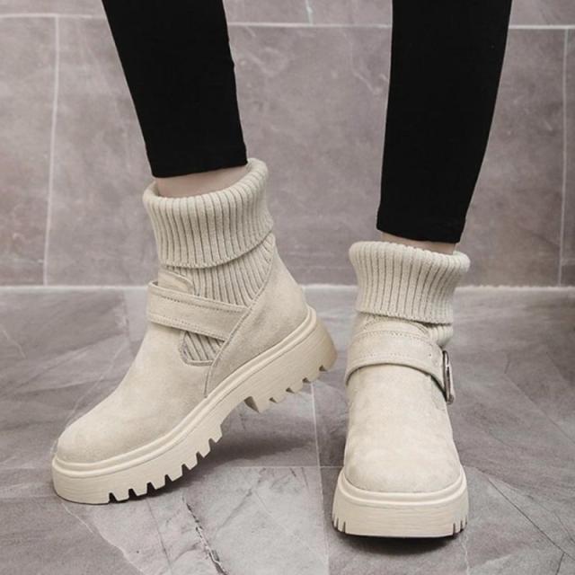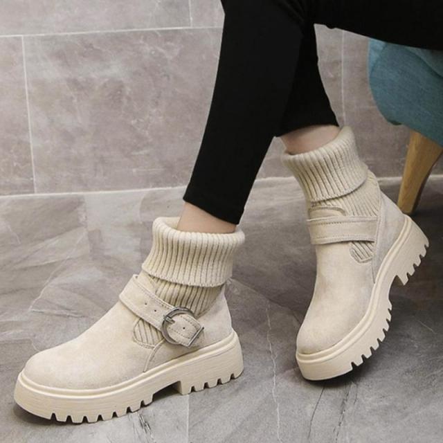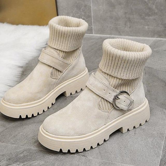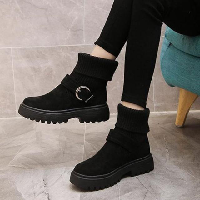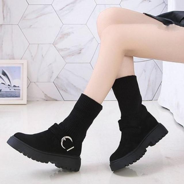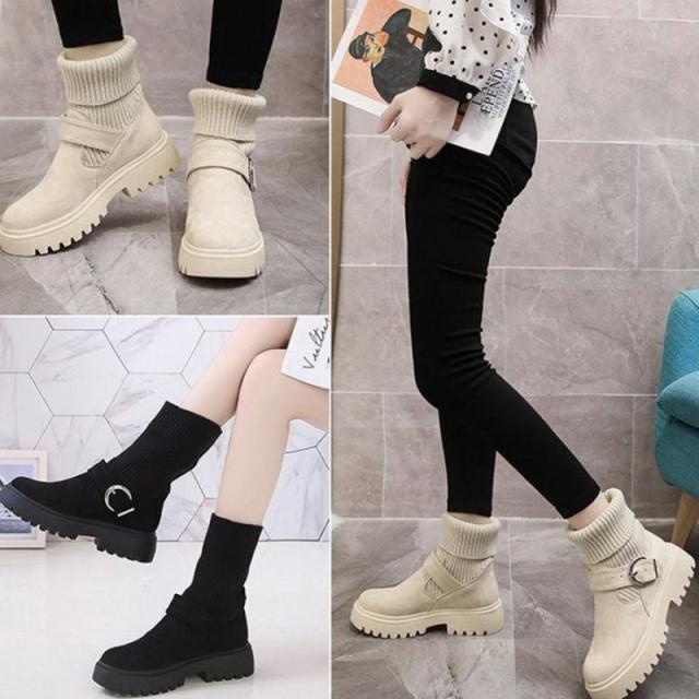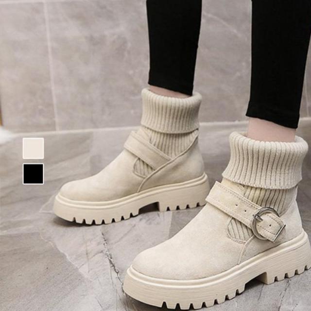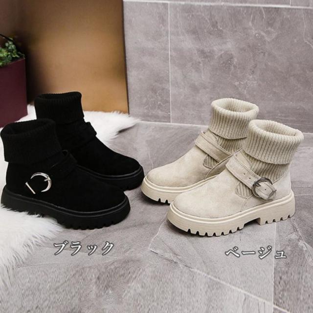 ソックス風 ショートブーツ レディース 2wayニットブーツ バックルベルト 厚底ブーツ 歩きやすい ハイカット ブーツ おしゃれ