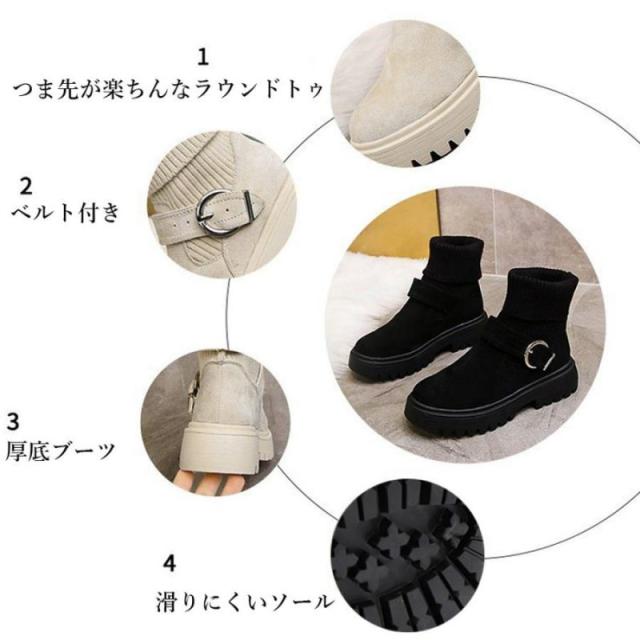 ソックス風 ショートブーツ レディース 2wayニットブーツ バックルベルト 厚底ブーツ 歩きやすい ハイカット