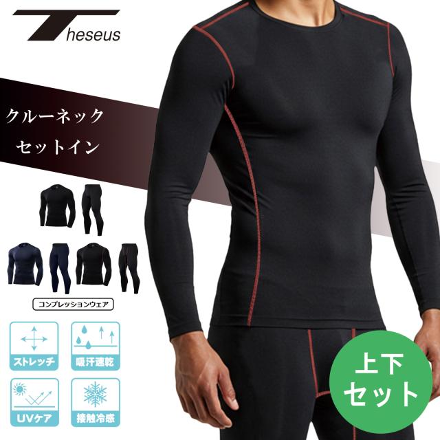 メンズ コンプレッション 長袖 ゴルフシャツ 上下セット シャツ レギンス インナー ウェア スポーツ ジム ジョギング ランニング サッカー ウェア トレーニングウェア スーツ 下着 春 夏 秋 冬 冷感 速乾 軽量 伸縮性 THESEUS テセウス TN11-21