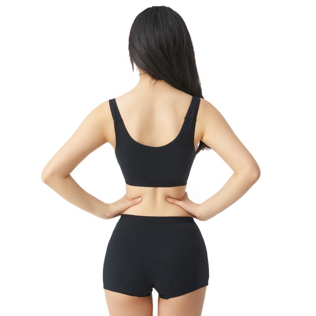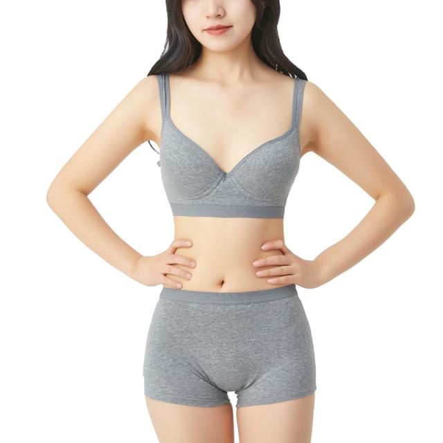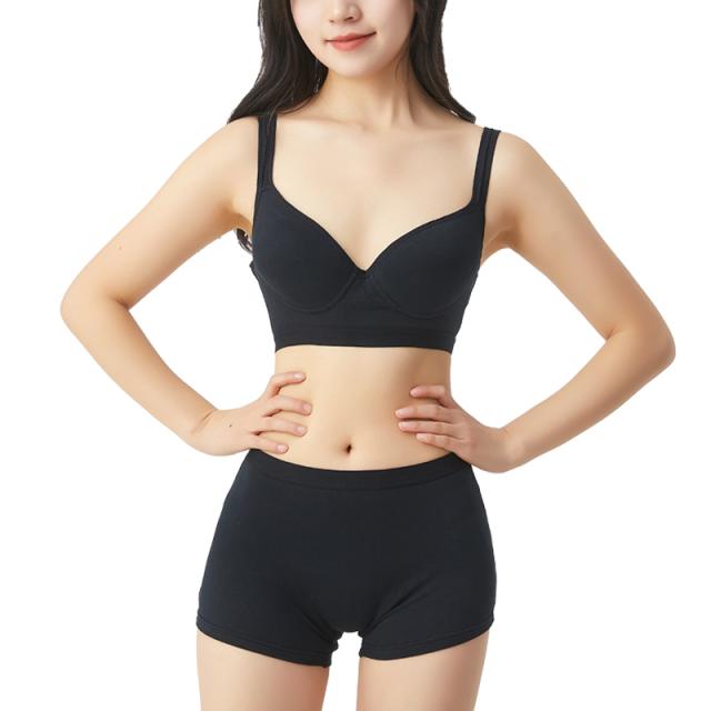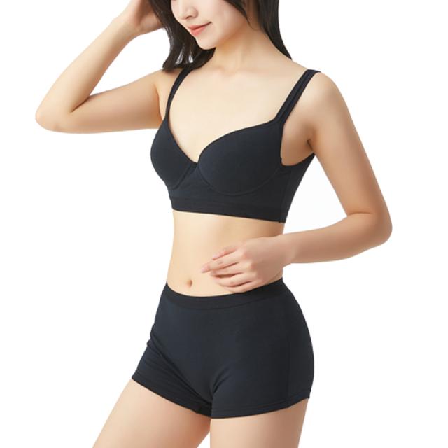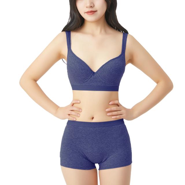 綿素材の快適スポーツブラジャー&ボクサーライプパンツ ランニングやヨガなどの運動時だけでなくリラックスタイムにもおススメです *きれいな丸みのモールドカップ *肩への負担が少ない幅広ストラップ *ボクサータイプショーツはぴったりフィット