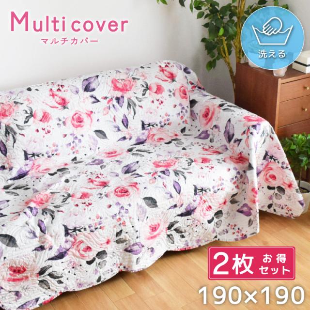 【2枚セット】マルチカバー キルト 北欧 約190×190cm 正方形 洗える こたつカバー マルチクロス ホットカーペットカバー ベットカバー ソファカバー かわいい おしゃれ カバー バラ 薔薇 柄