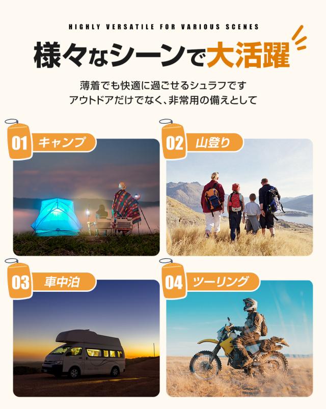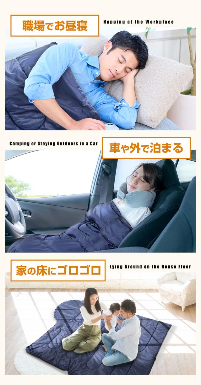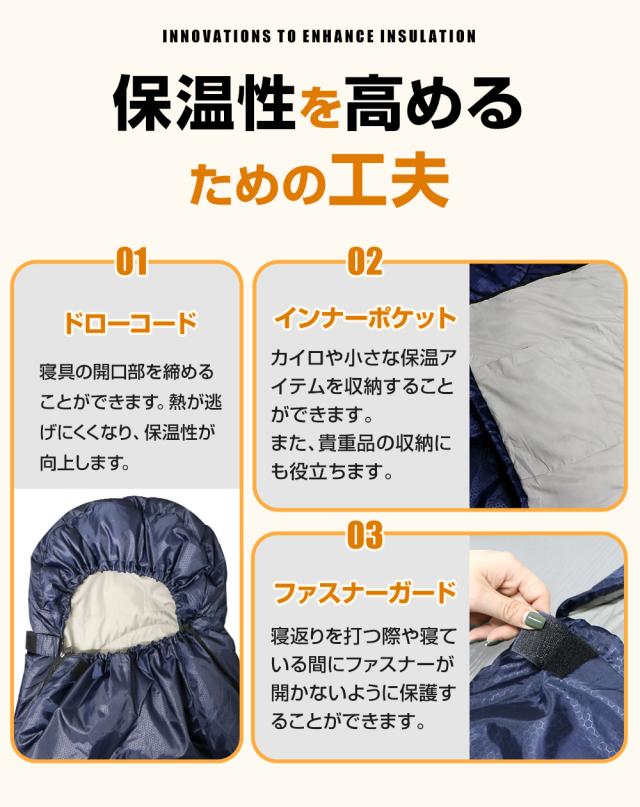 帽子には収縮コードとマジックテープで襟元も閉めることができ、寒気を防ぎます。右側にダブルジッパーは内外側どちらからでも、足元から肩まで開閉でき、封筒型なので、厚着で就寝しても圧迫感なし。寝袋のポケットには、時計などの小物を収納できます。ダブルファスナーを採用なので、足元から肩まで、内外側どちらからでも開閉でき、温度調節でも簡単です。キャンプ、BBQ、車、登山、アウトドア、天体観測、ツーリング、花見、会社残業、自宅での敷き布団、掛け布団代わり、災害時など場所問わず、役に立ちます。
