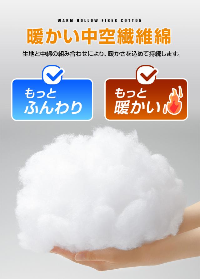 中綿を3Dファイバー製中空化学繊維を使用で、保温力と柔らかさ、軽さを実現しました。収納袋付き、小さくて超軽量なので、外出中負担感なく持ち運び便利です。