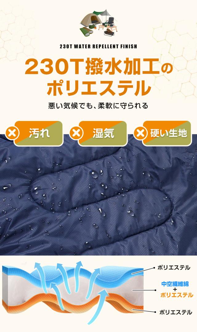 【230T超撥水・優れる素材】防水性の優れた230Tポリエステル生地を採用し、保温性、速乾性と快適さをすべて満足。また、高密度のポリエステル生地は、撥水が施され、通気度も低く、風や冷気を遮断できます。 裏地:上質な繊維素材で質感がよく、ふとんのように柔らかくて肌触りがよい、寝袋に入った瞬間でも暖かく感じられます。