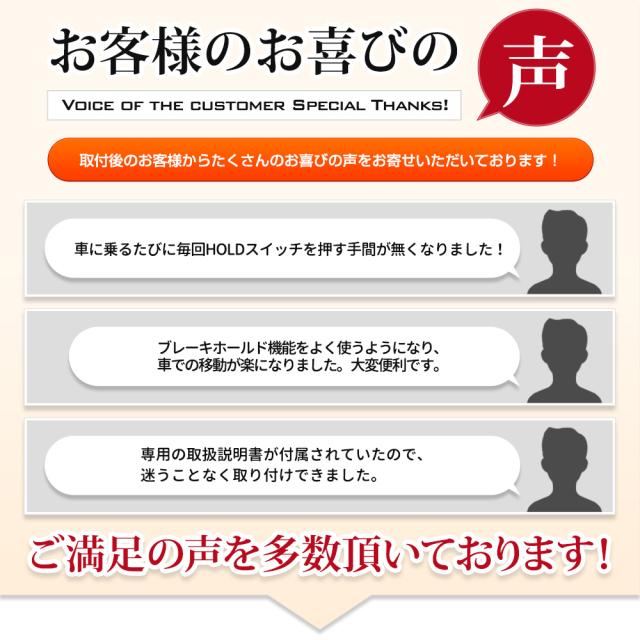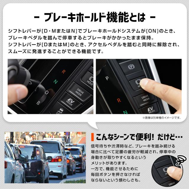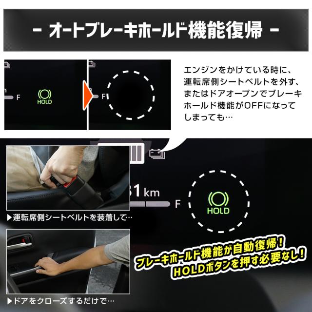 エンジンスタートでブレーキホールド機能がONに! エンジンを始動するたびに押さなければいけなかったHOLDボタンを押す必要が無くなる超便利パーツが登場! 本商品を取付けることで、エンジン始動から約5秒後に自動的にブレーキホールド機能が起動! わずらわしいスイッチ操作から解放されます! さらに、シートベルトを外すたび、ドアを開けるたびに解除されていたブレーキホールド機能が、 シートベルトを装着しドアをクローズするだけで自動で復帰! 信号待ちなどで態勢を整えたい時や後部座席に用事がある時などに大変便利な機能です。 取付後は、HOLDボタンを3回連続で押すと純正状態に変更が可能! 車検時に取り外す必要がありません。 純正状態に戻したあと、再びHOLDボタンを3回連続で押すとオートブレーキホールド機能がONに。 取付けに便利な内張はがし付きなので、届いたその日に取付け作業を行うことが可能です。 【ブレーキホールド機能について】 ブレーキホールドシステムがONのときに、シフトポジションがDまたはNでブレーキペダルを踏んで停車するとブレーキがかかったまま保持されます。 保持されている時は、ブレーキペダルから足を離してもブレーキが掛かったままになります。 アクセルペダルを踏むと同時に、ブレーキホールドが解除されてスムーズに発進出来ます。 |