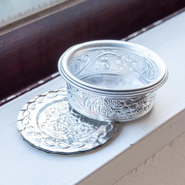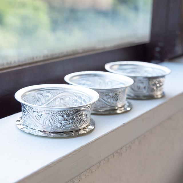 【送料無料・6セット】【3個セット】インド伝統唐草エンボスのアルミソーサーとコースターセット【直径:6.5cm-8cm】 / セット、飾りつき コップ、アルミ ボウル、食器、カトラリー インド アジアの食材 【インドとアジアン食品・食材
