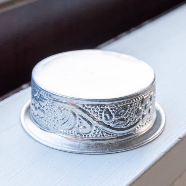 インドならではの美しい唐草模様の装飾がデコボコのエンボスになって入っている美しいソーサー。シンプルながらもインドを感じることができます!アルミ独特の光沢感が美しく、手で触れるとエンボスの凹凸を感じることができて、その凹凸には滑り止めの効果もあります。