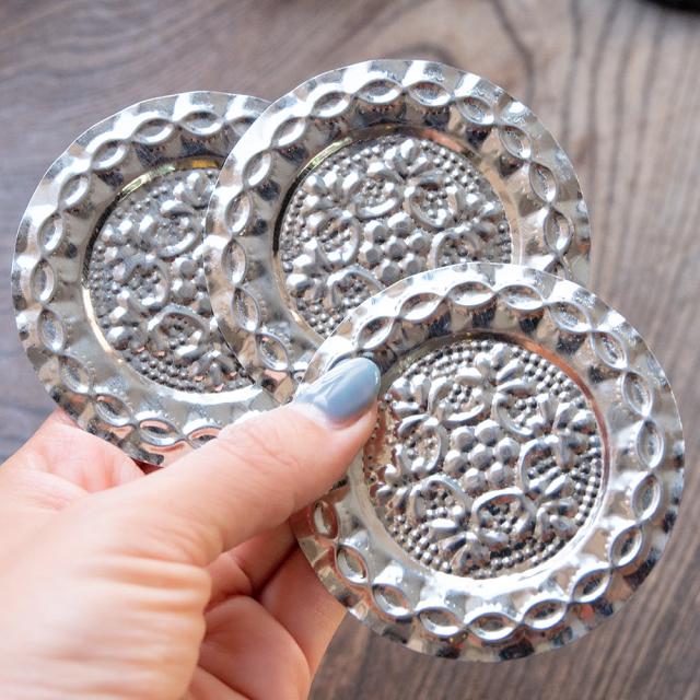 【送料無料 6セット】【3個セット】インド伝統唐草エンボスのアルミソーサーとコースターセット【直径:6.5cm 8cm】 / 飾りつき コップ ボウル 食器 カップ グラス チャイ ラッシー マグカップ コーヒー アジアン食品 エスニック食材