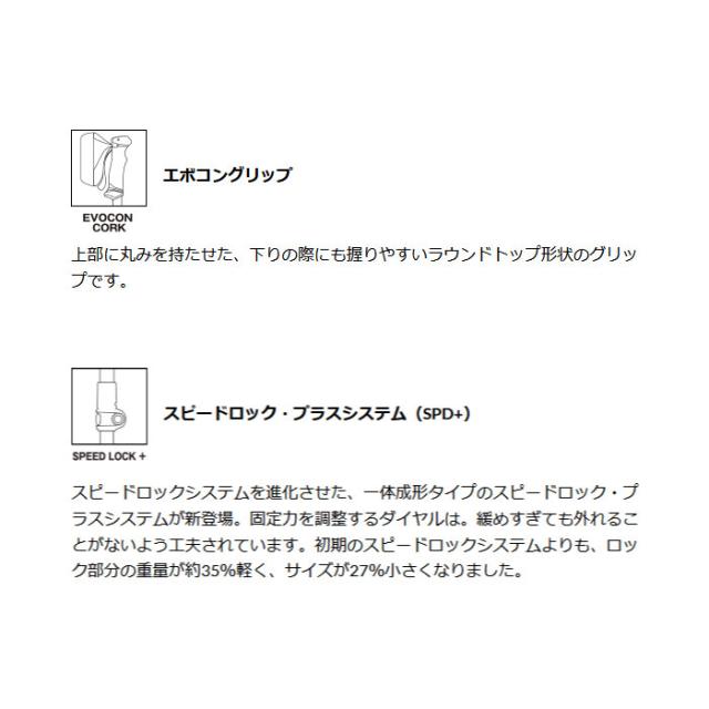 スピードロックシステムを進化させた、一体成形タイプのスピードロック・プラスシステムが新登場。固定力を調整するダイヤルは。緩めすぎても外れることがないよう工夫されています。初期のスピードロックシステムよりも、ロック部分の重量が約35%軽く、サイズが27%小さくなりました。