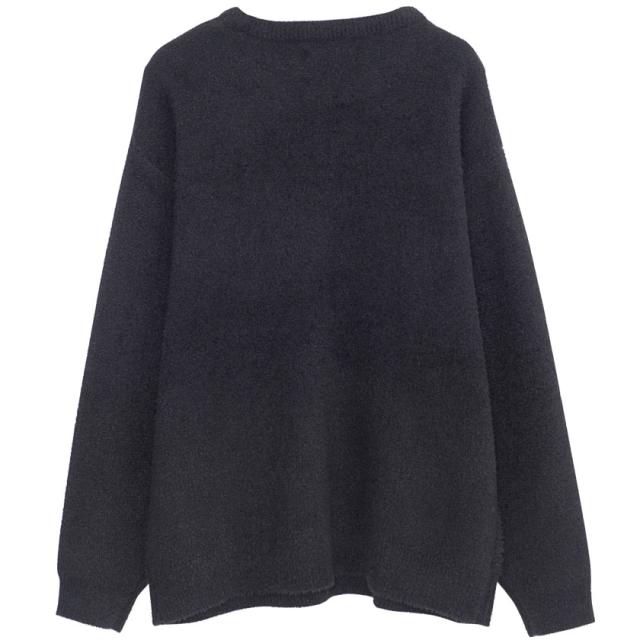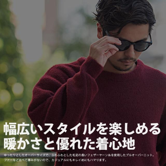 ゆったりとしたオーバーサイズで、ふわふわとした毛足の長いフェザーヤーン糸を使用したプルオーバーニット。