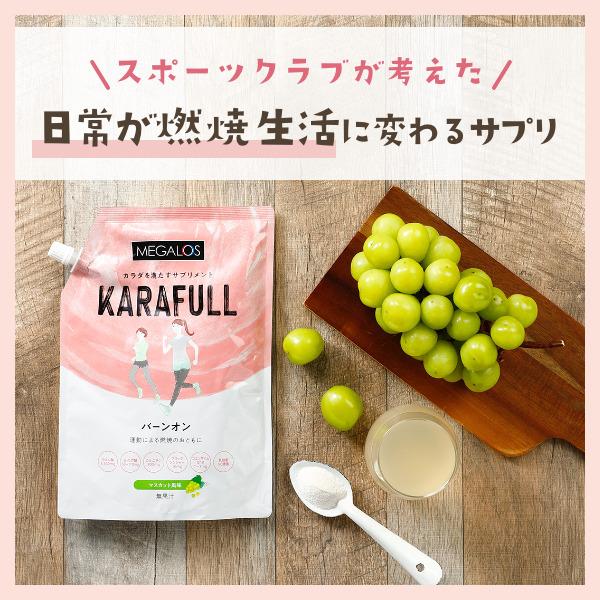燃焼系サプリメント マスカット風味 エネルギー クエン酸 L-カルニチン α-リポ酸 コエンザイムQ10 ブラックジンジャー抽出物 乳酸菌 KARAFULL バーンオン