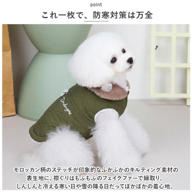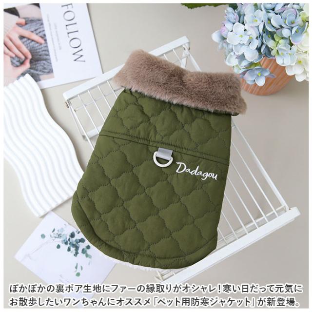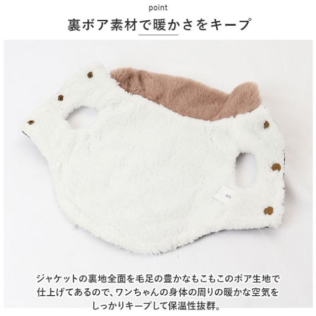 | 商品説明 | ・ぽかぽかの裏ボア生地にファーの縁取りがオシャレ!寒い日だって元気にお散歩したいワンちゃんにオススメ「ペット用防寒ジャケット」が新登場。 【これ一枚で、防寒対策は万全】 ・モロッカン柄のステッチが印象的なふかふかのキルティング素材の表生地に、襟ぐりはもふもふのフェイクファーで縁取り、しんしんと冷える寒い日や雪の降る日だってぽかぽかの着心地。 【裏ボア素材で暖かさをキープ】 ・ジャケットの裏地全面を毛足の豊かなもこもこのボア生地で仕上げてあるので、ワンちゃんの身体の周りの暖かな空気をしっかりキープして保温性抜群。 【スナップボタンで楽ちんお着替え】 ・ジャケットをふわりと背中に被せてから両前足を優しく袖に通し、前合わせのスナップボタンを閉じるだけで着脱が簡単なデザイン。 【足が短めなワンちゃんにも】 ・よちよち歩く姿が可愛い♪コーギーやフレンチブルドッグなど手足の短めなワンちゃんでもピッタリ着れるノースリーブタイプ! 【お散歩前の準備がスムーズ】 ・ウェアの背中部分には、リードが直接つなげるD-リングパーツ付き。お散歩前に首輪やハーネスを用意しなくても、ウェアを羽織ってリードを接続したらすぐにお散歩にGO! 【おトイレの時も安心】 ・お腹まわりやお尻は大きく開いたデザインなので、おトイレで生地を汚す心配がないのも嬉しいポイント! 【ご家庭で簡単お洗濯♪】 ・取り扱いが楽なポリエステル素材なので、優しく手洗いすればご家庭で手軽にお洗濯OK!こまめにお手入れしていつでも清潔な着心地をキープ。(※タンブラー乾燥はご利用いただけません。) 【ピッタリサイズをチョイス!】 ・Sサイズから2XLサイズまでの5つのサイズから、ぴったりサイズがチョイス可能!超小型犬から、胴回り52cm程度までの中型のワンちゃんに最適なサイズ感。小さなサイズはネコちゃんにもオススメ。 【オシャレなお散歩コーデに】 ・アースカラーのキルティング生地にココアブラウンのファーが飼い主さんの秋冬ファッションに素敵にシンクロ。冬の散歩道に映えるオシャレなカラーラインナップ。 |