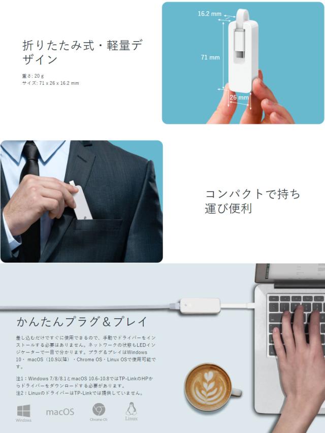 | 製品構成 | USB Type-Cギガビット有線LANアダプター、ユーザーガイド |
