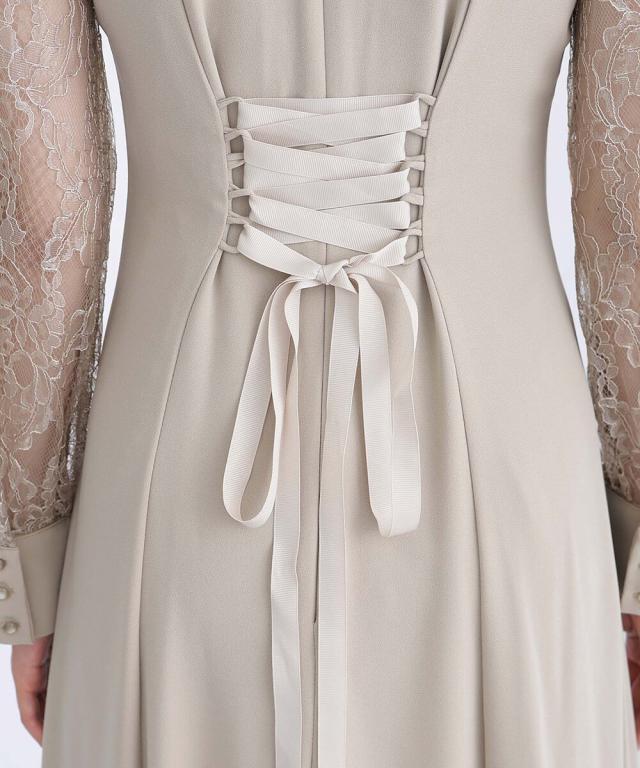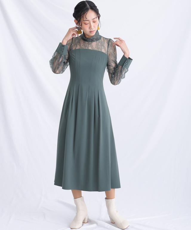 無地の生地にレースが施されたフェミニンなドレス。