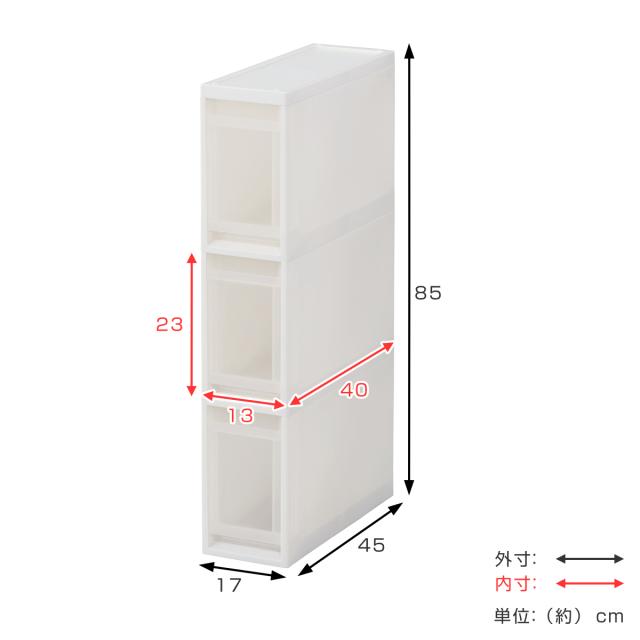 | サイズ | 約 幅17×奥行45×高さ85(cm) 引出し内寸:スリムSサイズ幅13×奥行40×高さ23(cm) |