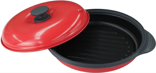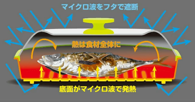 | 電子レンジのマイクロ波で底面の特殊素材が発熱します。マイクロ波を反射するフタをすることでレンジ使用時のように食材のパサつきを抑え全体に熱がいきわたるのでふっくらとした仕上がりになります。加熱加減により食材底面に焼き目が付きます。内側表面は焦げ付きにくいようにフッ素加工されています。 |